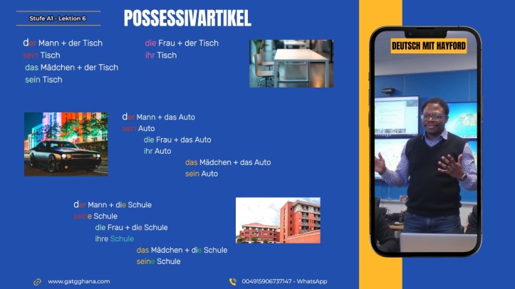 Los artículos posesivos indican posesión o pertenencia. Se ajustan a la persona (mein, dein, sein/ihr…) y concuerdan con el género y el caso del sustantivo..