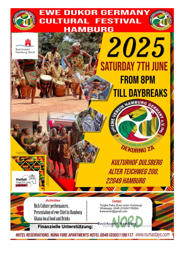 The Ewe-Verein e.V. Hamburg, in collaboration with Ewe Dukor Germany (EDG), and with financial support of the state of Hamburg (District council of Northern Hamburg ) proudly announces the 2nd Ewe Dukor Cultural Festival to be held in Hamburg, Germany. Following the resounding success of the inaugural festival hosted by Ewe Union München e.V. in Munich in May 2023, this year’s edition promises to be even more spectacular.