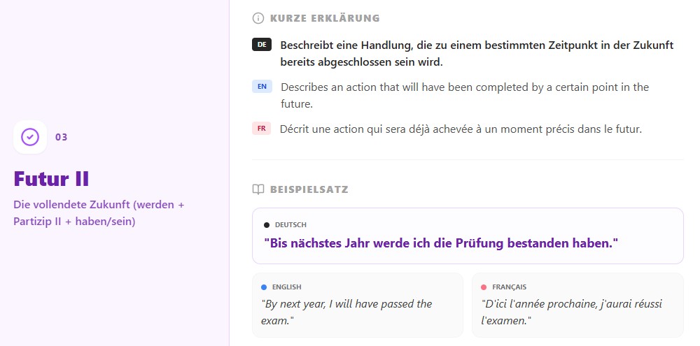 Français : Futur II = werden + participe II + haben/sein. Il montre qu’une action sera déjà terminée dans le futur.